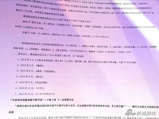 从现场的日程表发现,腾讯2016年将会上映7部电影,其中包括备受关注的《魔兽》电影,上映时间定在6月份。此外,由顾漫原作小说改编的《微微一笑很倾城》,郭敬明原作小说改编的《爵迹》都定档8月上映。