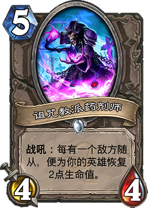 诅咒教派药剂师:战后效果每有一个敌方随从在场上,便为你的英雄恢复2点生命值。这张牌从效果上看可以很好的对抗铺场卡组,比如术士小鬼爆破打四,猎人一波放狗,5费44略微亏点身材,但对面小鬼爆破打4之后,这张牌不仅能奶8血还会有个44身材的随从占场,但问题来了,你能保证每次都遇到铺场职业么?而且同福爆破总能打4?这种个不稳定的“新司机”说不定还会面对裸下的尴尬局面。