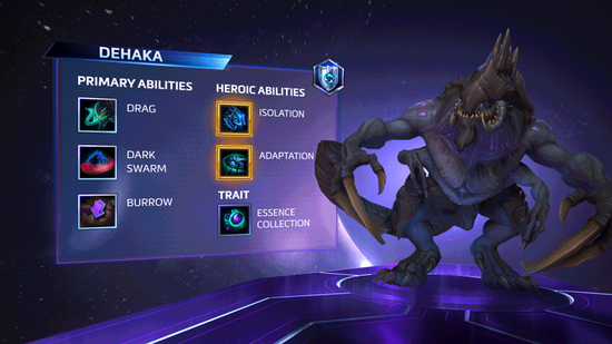 这名从星际争霸宇宙到来的全新战斗型英雄还带来了全新的游戏机制。德哈卡没有坐骑,但能够使用 隐蔽猎手 技能传送到地图上任意地方的草丛中,这将赋予他极大的全地图机动能力。
