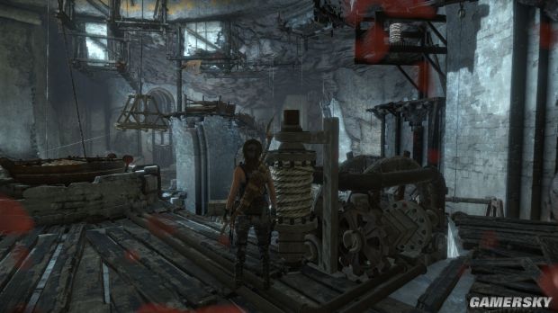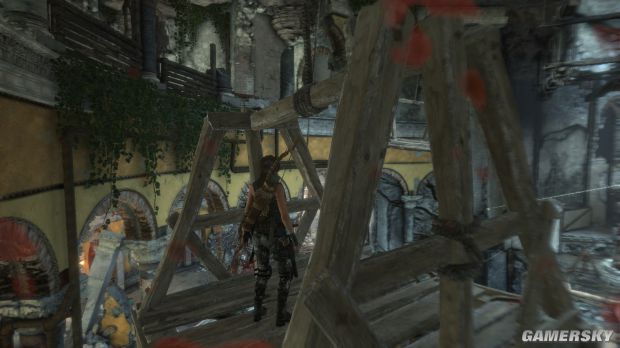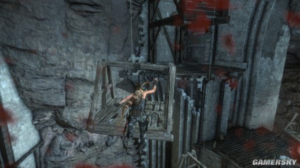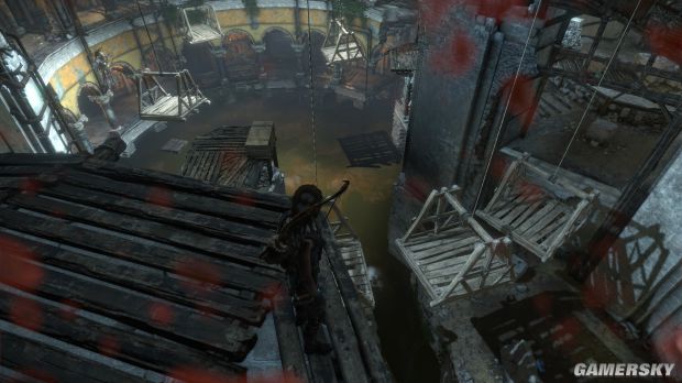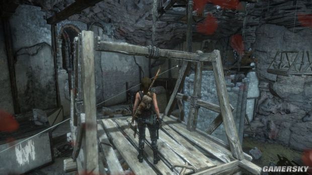 1、等到左边这个较矮的木板移动到跳台时用弓箭瞄准右上角的绳索,用余光看着木板,等到过了高台后立刻把绳子固定上,然后跳到木板上,绳索控制的木板能支撑30秒。跳到木板上大概是5秒。