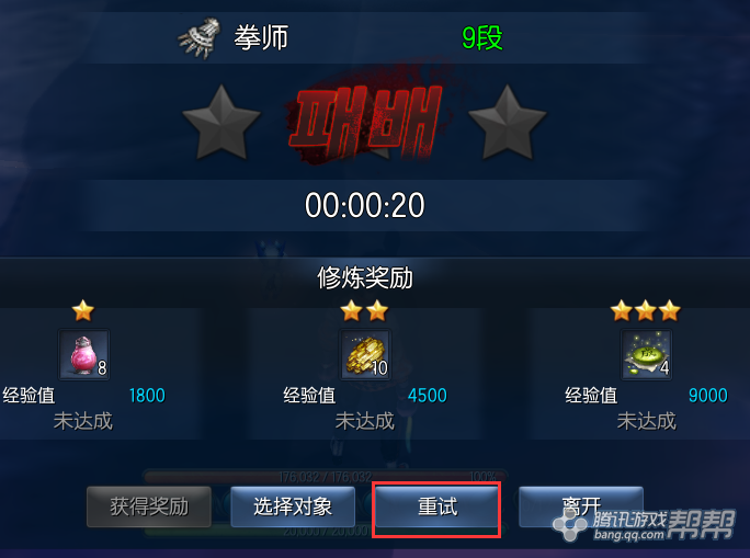 挑战失败,可以点重试再一次挑战或者重新选择对象进行挑战