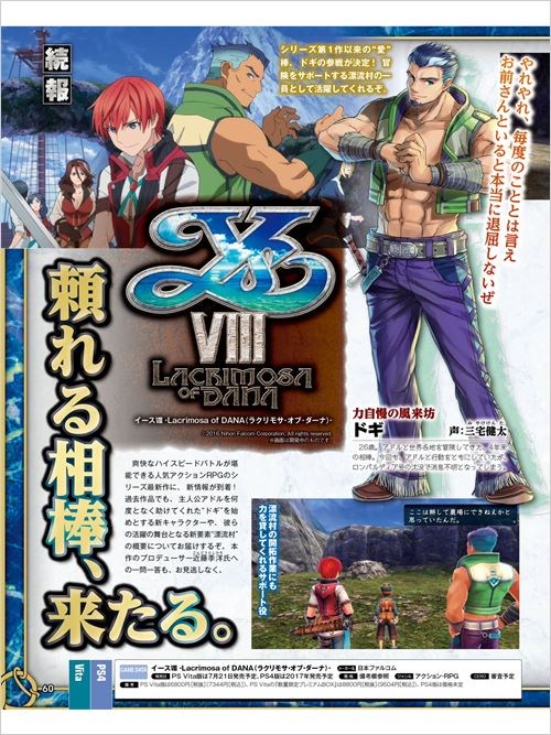 《伊苏8:达娜的安魂曲》是由Falcom所推出的PSV/PS4双平台ARPG新作,游戏的PSV版将于2016年7月21日先行发售,其中通常版售价为7344日元(含税),数量限定珍藏BOX售价为9504日元(含税)。日前本作最新的杂志图已经出炉,为大家介绍了包括多奇在内的几位新登场角色以及新要素“漂流村”等内容,下面就为大家介绍一下。