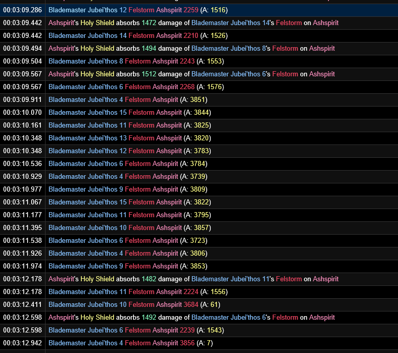 从图1可以看出,剑圣的分身对我造成了26次邪能风暴(不知道翻译的对不对)的伤害,每一个都清楚地写道来自哪一个分身,但是神盾的格挡次数为0。这就是我所说的,当法术伤害被完全吸收时,神盾不发挥作用。