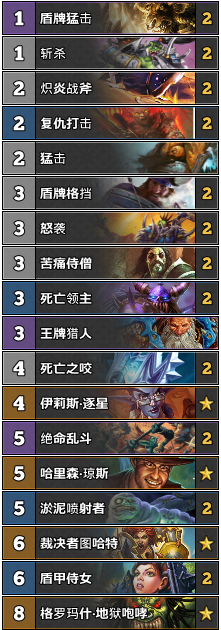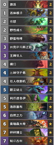 自然之力咆哮combo,跳费带来水晶上的优势。可以控场也可以主动进攻施加压力,用最经典的组合技击败对面,咆哮德继续维持着王者的地位。几周的休息后,环境没有太大变化;最好的证据就是咆哮德继续统治T1。有趣的是,最近传统防战发生了很多变化,很多人认为咆哮德克服防战,但如果挖宝防战能够有效除去咆哮德的生物并且发挥伊莉丝的效果是可以与之对抗的。尽管咆哮德饱受动物园和奴隶战的困扰,但一旦牌序稳定,仍然可以依靠传统组合技压倒敌人。
