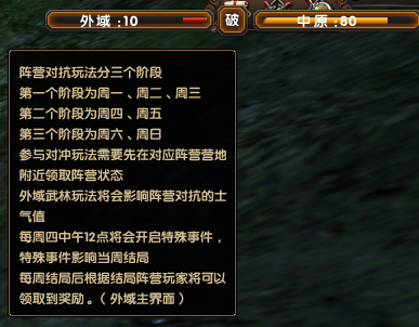 之后就是重要的阵营抉择啦!通过参加相关玩法,可以获得中原或者外域相应的偏向值。当偏向值相加达到100后,按各个偏向值的大小判定阵营归属!