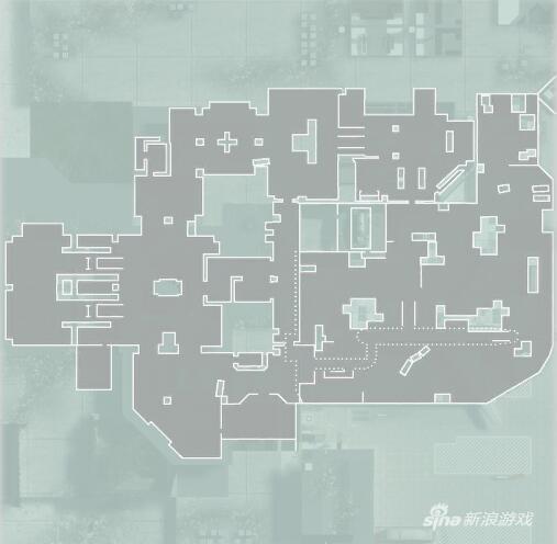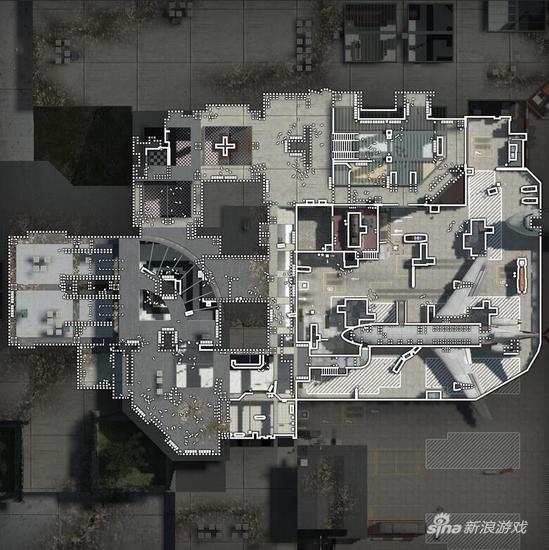 俯瞰外部的部分的主要走廊,地面上任何人都可以轻松地通过窗户射击杀死看到的目标,包括飞机驾驶舱的敌人。地图中心的商店是战略重地链接机场外面以及相邻的走廊。