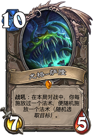 史上节目效果最爆炸的一张橙卡,没有之一,除了绚丽的法术释放之外,还可能把尤格萨隆自己打死,而且你自己也可能被打死。
