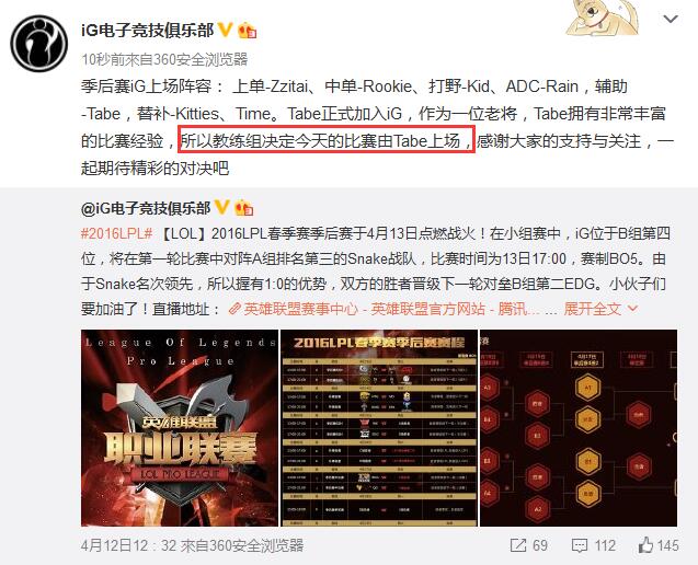 关注过英雄联盟S5比赛的网友对tabe在主持台上泄密IG战术事件一定会有所耳闻。去年的S5总决赛中Tabe被拳头官方邀请替代Doublelift坐在了解说席。然而在刚刚的iG与ahq比赛赛前,却发生在直播台泄露战术的事件。