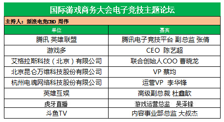 作为大会重要组成部分,由中国音数协游戏工委承办、上海游戏多网络科技股份有限公司协办的国际游戏商务大会电子竞技主题论坛将同期举办,作为去年游戏行业最炙手可热的热门话题之一,论坛将邀请国内多家已涉足电竞的游戏发行公司、研发公司、直播平台共同参与,一起展望中国电竞市场的明天。大会公布了参与本届论坛的企业掌门人或高管名单。4月19日上午9:00,北京国家会议中心307AB厅,不见不散。(嘉宾排名不分先后顺序)