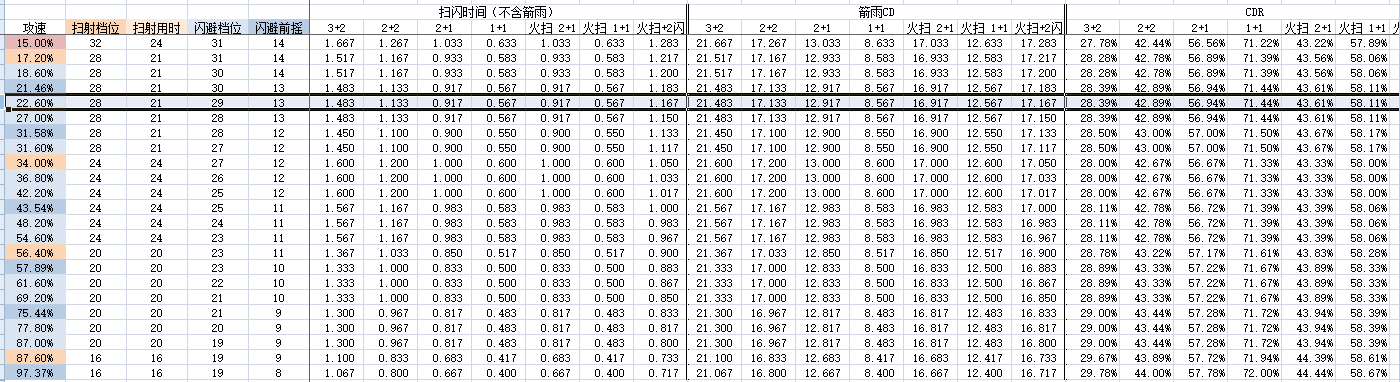 角色实际CDR比表上的数值少一点点有时候也是可行的,因为可以向箭雨的动作借(具体借前摇还是后摇我忘记了)。但具体够不够、卡不卡手需要实战检测。