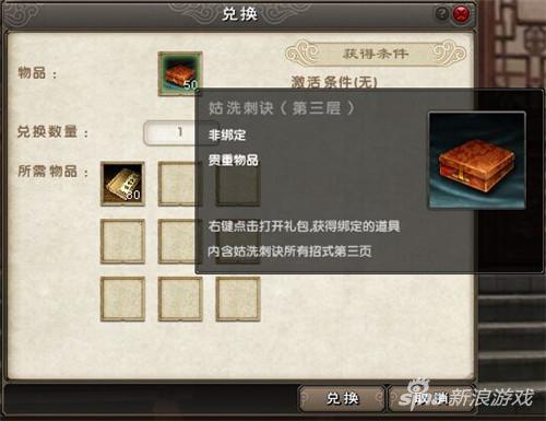 找到后,点击“兑换”按钮即可出现10套江湖武学的兑换界面。
