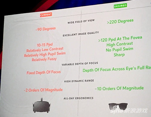 迈克尔在去年的Oculus Connect 2大会上也描绘了Oculus对虚拟现实未来发展的愿景。如上图,同样都是在Rift迭代的基础之上,向更简易携带的普通眼镜规格发展。