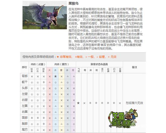 做武器需要四根黑狼鸟的坚背甲,黑狼鸟的坚背甲只能靠破背才能获得,而背部的肉质是最坚硬的,也是最难成功击打的部位,近战攻击会造成弹刀也是 无可避免的,这也对猎人们造成了很大的困扰。首先合理使用道具和选择正确的进攻手段。黑狼鸟倒挂尾击停在空中的时候,使用闪光弹,造成倒地晕眩效果,倒地 之后能够容易锁背攻击。落穴陷阱也能够使黑狼鸟的背部露出来。麻痹陷阱能够使黑狼鸟尾巴产生硬直,攻击尾巴根部的弹刀部位也能破坏背部。如果是远程则更加 简单了,推荐使用水属性的贯通弓,能够有效攻击背部,弩方面则使用贯通弹进行背部打击。如果有使用铳枪的朋友那就更加简单了,连道具都不需要,只用炮击进 行攻击则可轻松破背。