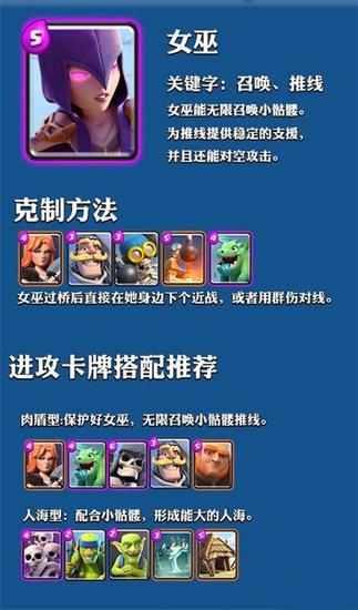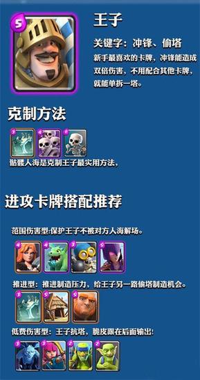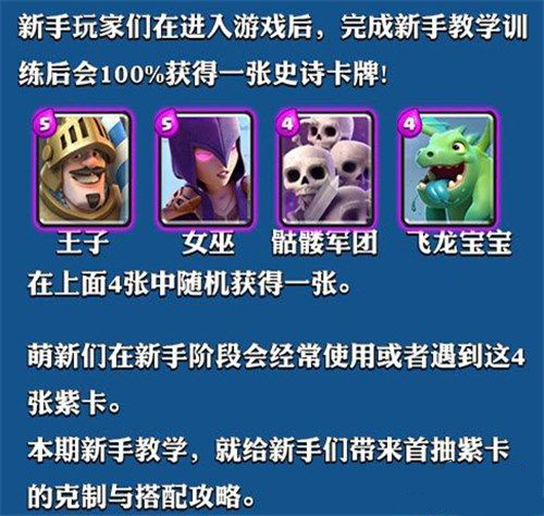 新手玩家们在完成新手训练后,会从王子、飞龙宝宝、女巫、骷髅军团4张紫卡中随机获得一张紫卡。下面小编为新手玩家们带来首抽紫卡的搭配和克制攻略。
