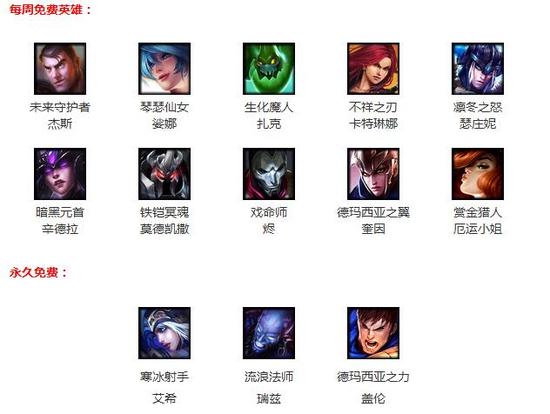 另外,在中国的服务器中,我们额外增加了三个永久免费的英雄——寒冰射手艾希、德玛西亚之力盖伦和流浪法师瑞兹。这三个英雄是永久免费供所有玩家使用的。主要目的也是便于那些刚刚打完新手实战训练营的玩家能够至少有一个自己会用的英雄。