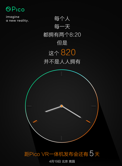 有海外媒体的消息传言Pico将于4月19日举行VR一体机发布会,近日Pico官方微博也发布了2天后的新品倒计时海报,从曝光的海报文案中可以看出,820芯片和分体式设计为该产品的主要卖点,除了这款命名Pico Neo的VR新品发布外,届时来自全国各地优质内容及游戏开发商、媒体和行业大咖也会参与其中。