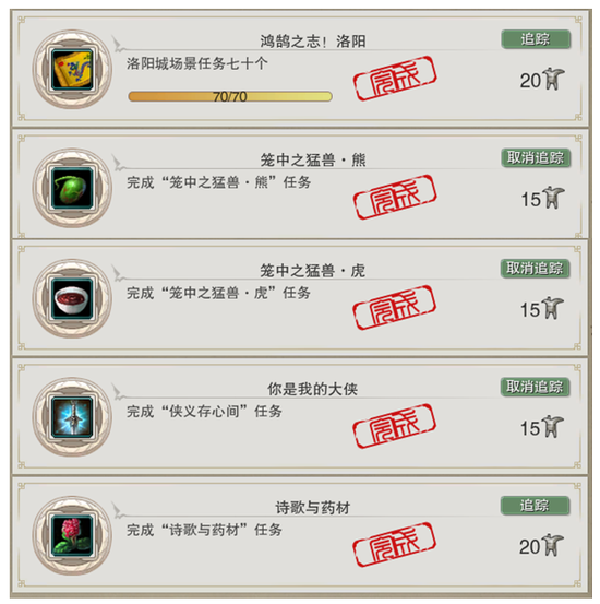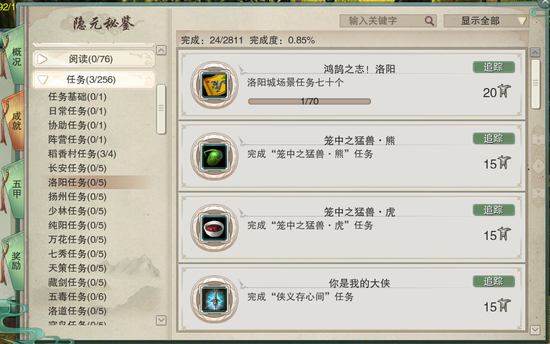 键盘按键Y调出隐元秘录——点击成就菜单——选择“任务”-洛阳任务-点击追踪