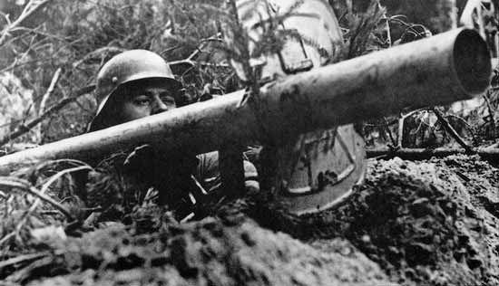 (图5 躲在掩体中手持“坦克杀手”的德国士兵)但是对德国人不利的却是1个小时后由科涅夫元帅率领的乌克兰第一方面军在尼斯河发动的攻势。科涅夫的军队在渡过尼斯河后发展进攻。虽然德军第四 装甲集团军在下午发起的反击一度延缓了科涅夫的攻势,但到了晚上,乌克兰第一方面军仍是向前推进了14.4公里, 形成了27.2公里宽的进攻阵地。虽然战果不大,但是比起他竞争对手(朱可夫)的表现却是强了太多。