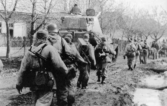 (图6 配有STG44突击步枪的党卫军装甲部队战斗力依然强悍,照片中可以看到“虎王”坦克庞大的身躯)4月16日晚上,斯大林与朱可夫进行了两次电话交谈。斯大林对他的这位被誉为“胜利象征”的最得力副手的目前表现很是恼火,他向朱可夫训话,要 求泽劳弗高地必须在次日攻克!斯大林又补充说“如果你不能胜任这个任务,大本营将命令科涅夫的坦克部队从南面攻入柏林。”朱可夫很是气恼。