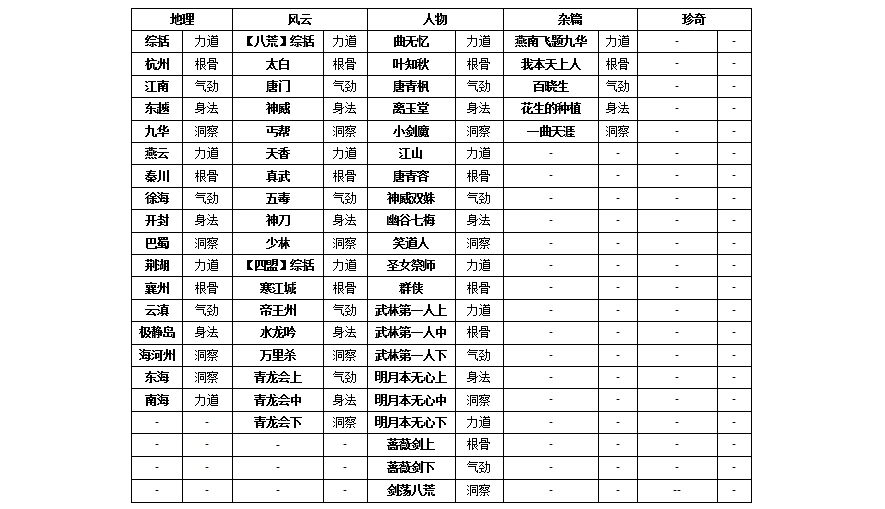 [人物篇]《四盟承志》五维属性+3、《八荒剑秀》五维属性+4、《武林第一人》五维属性+3、《明月本无心》五维属性+3、《蔷薇剑》五维属性+2