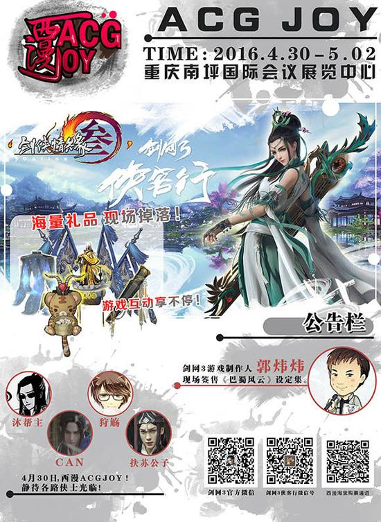 江湖快马飞报!4月30日《剑网3》游戏制作人郭炜炜将现身重庆,开启西漫ACGJOY主线剧情。郭大侠将现场签售《巴蜀风云》设定集,欢迎各路侠士齐聚山城,近距离调戏。壕礼送不停!游戏周边、珍惜挂件激活码现场掉落!小红手们快来翻牌吧!更有红人沐帮主、狩觞到场助阵!苍云粑粑还是老琴爹?尽在4月30日西漫ACGJOY,静待各路侠士光临。