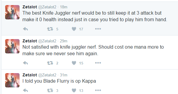 对目前的削弱不是很高兴,明天看见新卡之前还不能判断。盗贼需要一些变态的新卡。