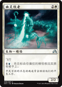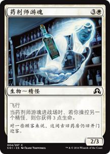 蓝白本是飞行生物较多的颜色,可以发现许多飞行生物都具有“精怪”这个副类别,那就可以与一些关键张进行配合。例如幽灵牧者和药剂师游魂,前者可以让目标精怪回手以使得自己的飞行生物在阻挡了对手庞然大物的攻击之后,得以保命进入手牌而不用死去进入坟场,而后者被不断回手后再拍下就能反复通过进场异能获得生命。那么场上只要稍稍站着几只飞行精怪作为穿透的攻击力持续给对手造成血量上的压力,剩下的用来倒腾出组合技,对手就要欲哭无泪啦~