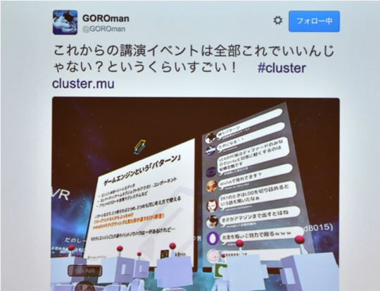 日本的一位用户不禁感叹“以后的演讲活动都用这种形式好了”。据悉,Cluster还打算在应用内加入支付功能、活动会场的一些特色定制功能以及展台展示和销售功能(瞬间想到淘宝的Buy+计划,不过这个比Buy+计划更容易实现),也就是说其已经开始向盈利的方向考虑。