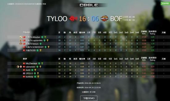 下半场,BOF拿下手枪局后连拿3分,6比12,随后下半场的第一个长枪局,TyLoo中Somebody发挥出色,帮助队伍拿到下半场第一分。此后TyLoo一鼓作气,连拿3分,以16比6的比分结束第一场。