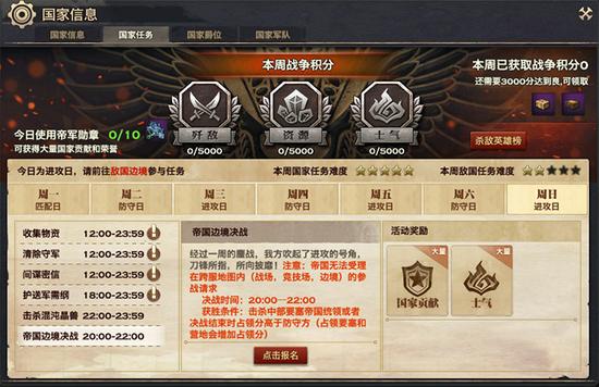 每周日12点将开放帝国边境决战的报名,69级以上的谕霸在本周战争积分达到3000分之后都可以报名参加(国家军队的成员在报名和排队中具有优先资格)。