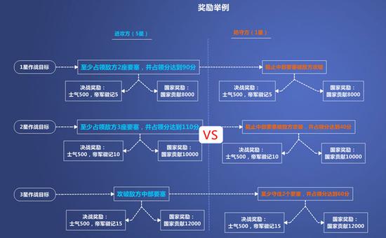 例如:我方是防守方,实力1星,对方是进攻方,实力5星,那我方只需守住2个要塞,并占领分达到60分就可达成 3星作战目标,而此时敌方就无法完成任何的作战目标。在这种情况下,我方3星失败可以获得30000国家贡献的作战目标奖励,而敌方0星胜利,只能获得 10000国家贡献的胜利奖励。即使最后敌方获得的了胜利,最后我方获得的奖励反而会远远超过敌方。