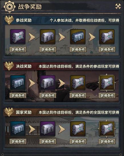 攻防决战奖励分为参战奖励、决战奖励和国家奖励3部分。