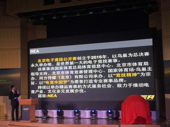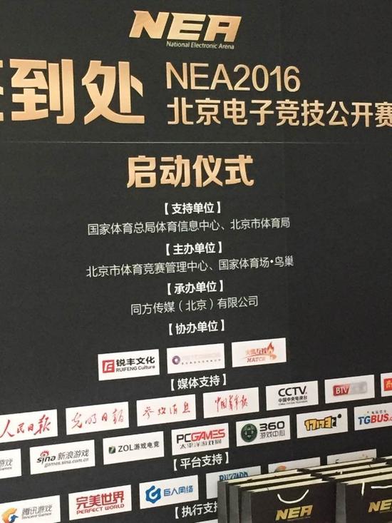 4月26日,由国家体育总局体育信息中心、北京市体育局指导支持,北京市体育竞赛管理中心、国家体育场·鸟巢主办,同方传媒(北京)有限公司承办的2016北京电子竞技公开赛(National Electronic Arena,简称:NEA)在清华同方科技广场国际报告厅召开了盛大的启动仪式,国家体育总局体育信息中心、中国体育报业总社、北京市体育竞赛管理中心等领导,人民日报、新华社、北京电视台等50余家主流媒体均出席了此次盛会。