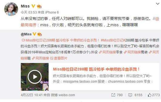 4月25日在刷微博的时候,无意间看到LOL知名主播MISS这样一条微博: