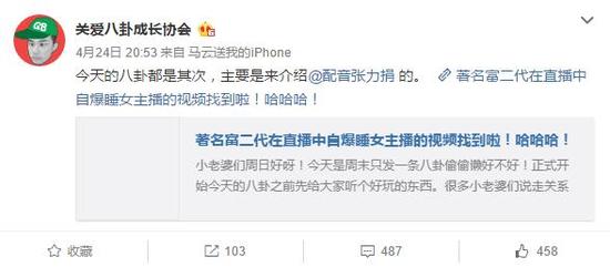新浪微博里有一个名为@关爱八卦成长协会 这个人,大部分的微博内容自然是与娱乐圈的八卦有关,最近他的微博接到一位网友爆料,说是某个著名富二代在和好友在线连麦的时大谈睡过多少女主播,期间好像说了些含糊其辞的话,可没曾想这好友是在直播,于是语音就流传了出来。
