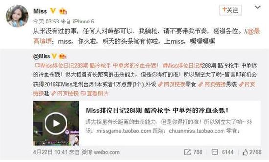 凌晨3点左右,MISS在微博针对一个名为最高境堺的回复做出回击。