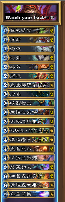 暗影打击: 我俗称它为“大背刺”,群友很多想知道,为什么带他,我就多说点。最开始我是不看好这卡的,实际应用中,也是类似背刺,有时挺卡手。多数情况我起手是不留 这张卡,只有打那种我可能浪费伤害去解生物的英雄职业卡组,我才选择起手考虑留。比如萨满的234。这卡的作用,主要是为了中后期的时候,一发打出解个4 血的克苏恩334,或者解大帝等等,可以省一个刺骨。其次,是因为我卡组的构成,删去了毒药,就略微少了点解,所以带他补充。再次则是为了平衡法术和生物 的卡组比例,以往的蓝龙贼,都是法术量大于生物6张左右,这卡组是差不多各一半。但是因为有匪贼和毒心这2种卡,补充了低费法术刷牌,妈妈再也不担心缺法 术刷牌,就怕抓不到加基森TOT。至于大背刺打脸,目前我从未实现过,所以略过吧。