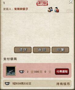 江湖中,飞鸽传输,邮寄物资十分常见。当大侠们收取物资数量较大时,请一定睁大眼睛看清楚每一封邮件的物品和金额。切勿贪图“快”而中了小人的圈套!江湖骗子们最喜欢2L、2L、2L……2d!