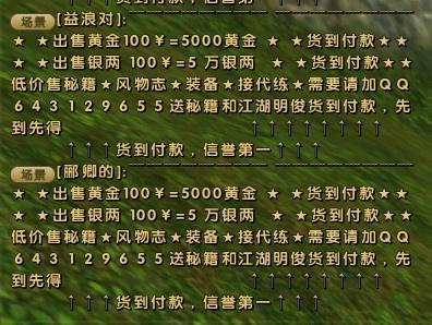 行走江湖之时,也常听人吆喝叫卖。什么银子1:500啦,什么百度搜索XXXX领取XX古谱、至尊啦、加QQ卖礼包等等,几乎都是骗子。超乎寻常的“便 宜”价格往往是吸引大侠们的关键,请一定要克制住诱惑,要相信天下没有免费的午餐!更不要加骗子的QQ接受某某文件,这些所谓的“图片”往往就是木马病 毒!