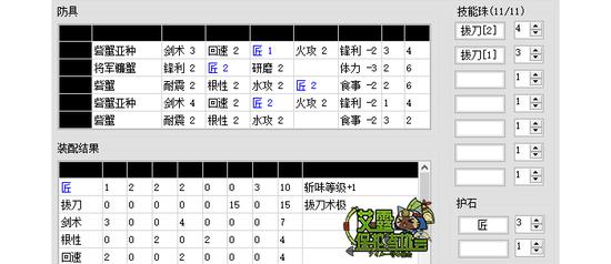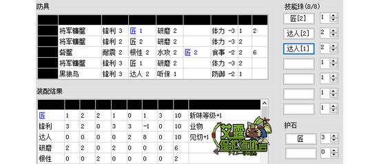 用匠护石的好处是在匠业物之余还能剩6个孔,可以考虑镶几个珠子加上零碎的技能点凑出极磨、见切1、根性、水属性攻击强化1、耐震中的一个。匠3和锋5的选择一般是根据自己的经济条件,毕竟匠3比锋5贵不少(以自己所在的区为准),同时多出来的副技能只起到锦上添花的作用。