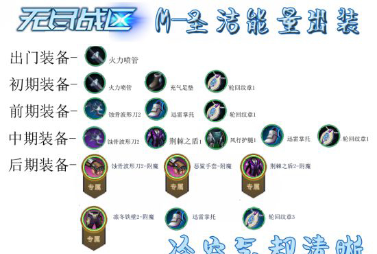 前期装备:过完初期之后,我们可以把武器升级为“蚀骨波形刀”,因为M这个职业技能是“叠加输出"的,一瞬间可以输出几十次,然而这个“蚀骨波形刀”拥有”减少对方护甲“的功能,这样更利于我们击杀对方。完成武器升级之后,我们再把鞋子升一级,升至“迅雷掌托”,这样更利于我们支援队友,压制对方!而且也利于我们逃离战区,不必为对方来抓我们而烦恼!