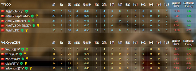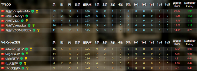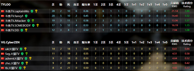 本场比赛状态低迷的tb进入下半场,TyLoo拿下手枪局之后直接手握14个赛点,尽管之后VG.CyberZen接连守下5分,但是对于整体局势来说已经无关紧要。随后TyLoo顺利攻下最后一分,以大比分16-6的绝对优势拿下了第二张地图的胜利。