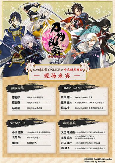 游族网络 独家代理《刀剑乱舞-ONLINE-》中文版据官方信息介绍,此次《刀剑乱舞-ONLINE-》中文版发布会邀请到诸多日方人士,DMM GAMES代表片岸宪一先生、《刀剑乱舞-ONLINE-》执行制作人花泽雄太先生、Nitroplus社长小坂崇气先生等重量级嘉宾,与游族网络首席运营官陈礼标、副总裁程良奇、运营总监冯荆荆一起公布此次合作的具体内容。此外,深受刀剑迷们喜爱的声优濱健人先生(陆奥守吉行 役)、井口祐一先生(萤丸 役)、浅利遼太先(平野藤四郎 役、明石国行 役)、入江玲於奈先生(前田藤四郎 役)也确定出席此次发布会,将在发布会现场与玩家展开亲密互动。