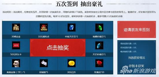 打卡签到,相信是每个上班族再熟悉不过的;天之禁中轻松签到五次,即可获取抽奖机会,100%必定中奖,永不落空,更有京东卡、Q币、酷炫草泥马坐骑相送,更为人性化的是,邀请好友,好友首次签到可为您累积签到次数。每多5个好友签到,都将多获得一次抽奖机会,你签到同样也可以给好友带来抽奖的机会的哦!