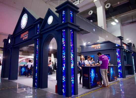 为了能够让玩家更好地感受到“重返依尼翠”的独特魅力,在动漫节展会现场专门搭建了一个颇具哥特风格的建筑,充满中世纪西方宗教建筑特征的设计令其在众多展位中显得如此与众不同。。令人惊奇的是,虽然处于熙熙攘攘地动漫展会之中,《万智牌》的展区却仿佛拥有一种截然不同的“气场”。