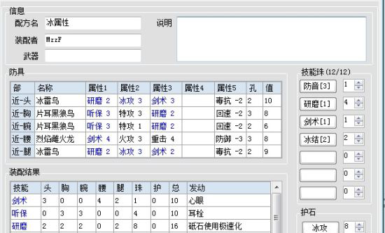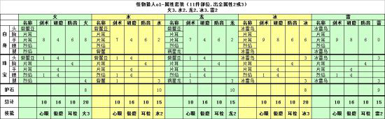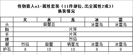 看了不少论坛,总结了前辈们的一系列属性套装,研究了一套用11件装备,就可以做出 火+3、水+2、龙+2、冰+3、雷+2的套装。