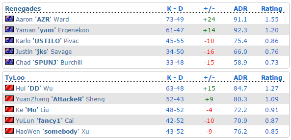 TyLoo选择的mirage,双方之前已经交手过两次。TyLoo分别以16-1和16-5的大比分获胜,在决赛中Renegades面对TyLoo也没有还手之力。