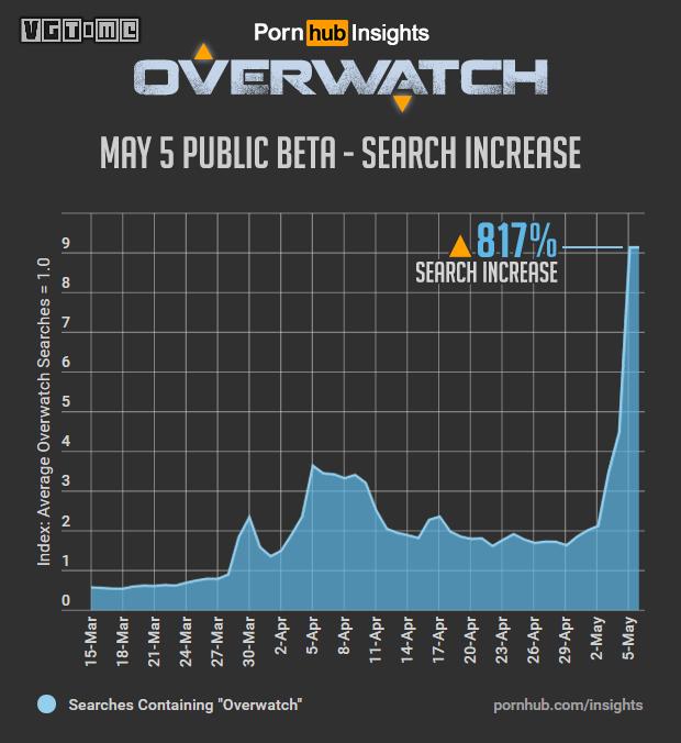 5月5日《守望先锋》(Overwatch)开始公测以后,在全球最大的成人视频网站PornHub上,以《守望先锋》为关键词的搜索突然增加了817%。