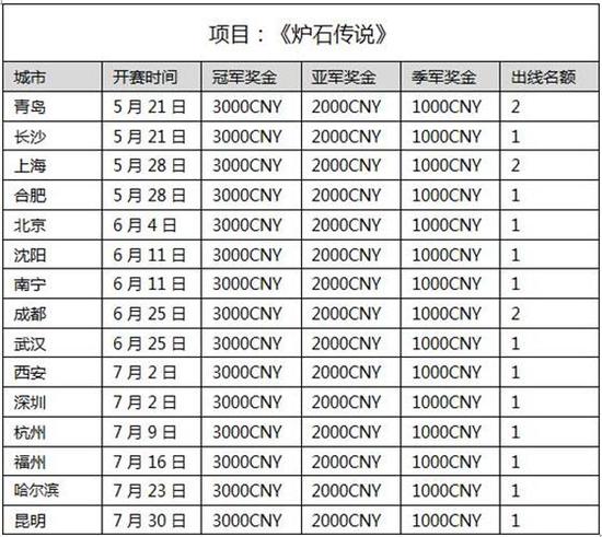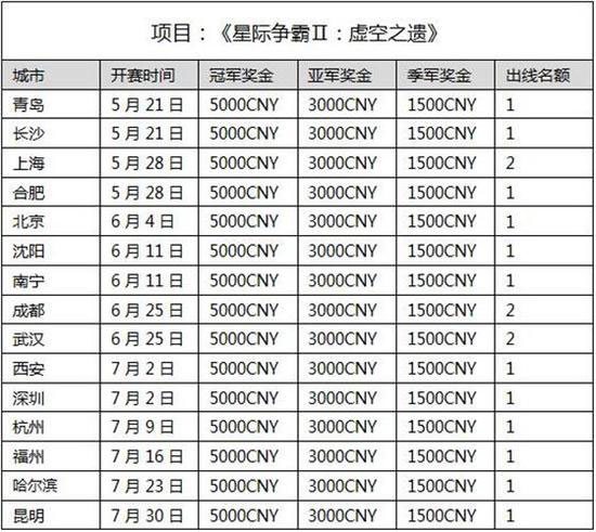 1。全国赛点开赛时间、奖金以及晋级名额如下: