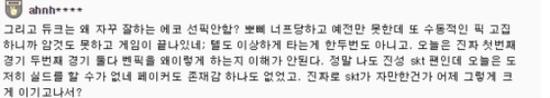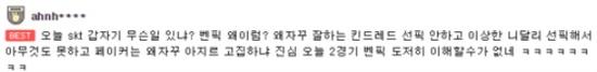 季中赛第二天,SKT迎来了最具考验的一天。SKT先是惨败给RNG,然后不敌FW。韩国的网友们瞬时间不淡定了,大部分粉丝将矛头指向教练组,当然也有指责队员发挥不好的。下面看一些韩国网友的评论吧。
